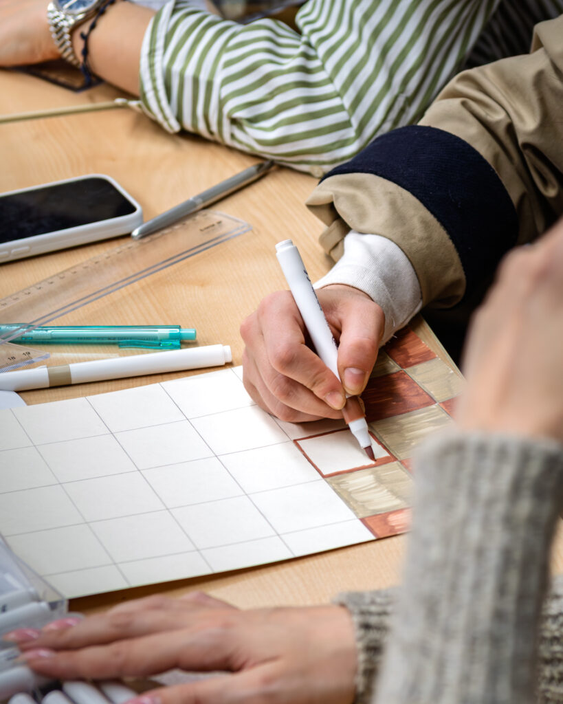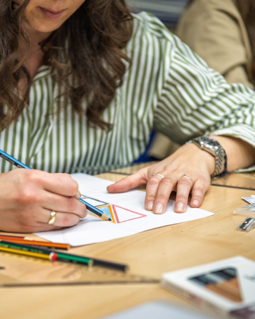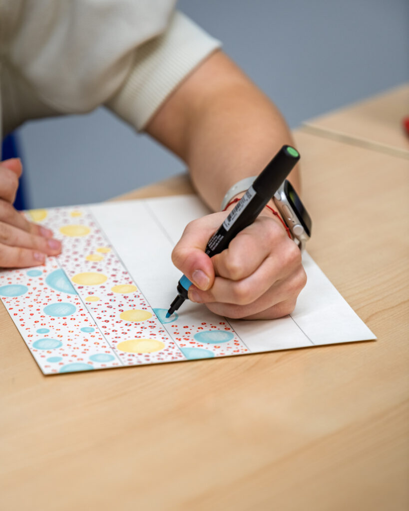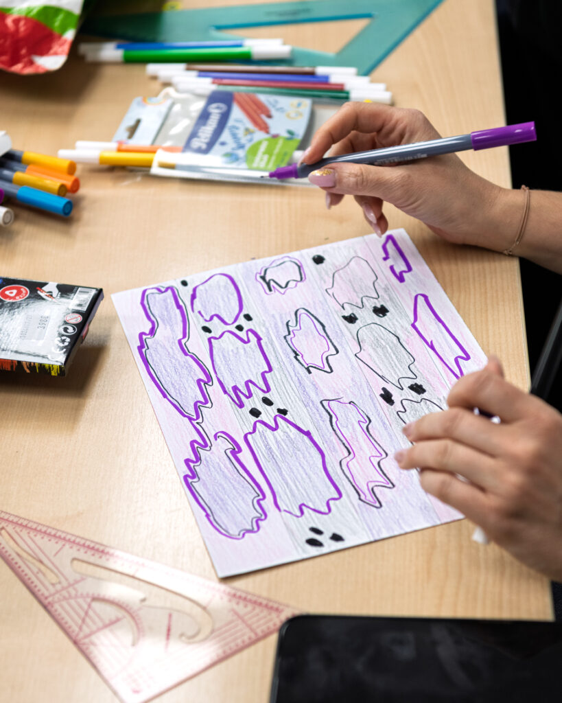 Na radionici dizajna tekstila polaznici su kroz crtanje i eksperimentiranje s bojama razvijali vlastite uzorke i vizualne koncepte. Korištenjem flomastera, boja i različitih tehnika osmišljavali su ritam linija, odnose boja i ponavljanje motiva – ključne elemente svakog tekstilnog dizajna. Naglasak je bio na slobodi izraza i istraživanju: od geometrijskih kompozicija i kontrastnih pruga do organskih, razigranih formi. Svaki rad predstavljao je osobni potpis autora, ali i prvi korak prema razumijevanju kako se ideja prevodi u uzorak koji može živjeti na tkanini.