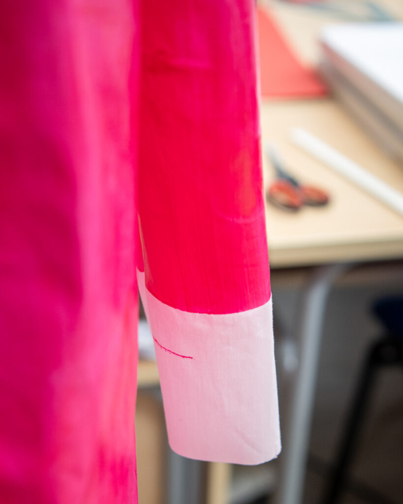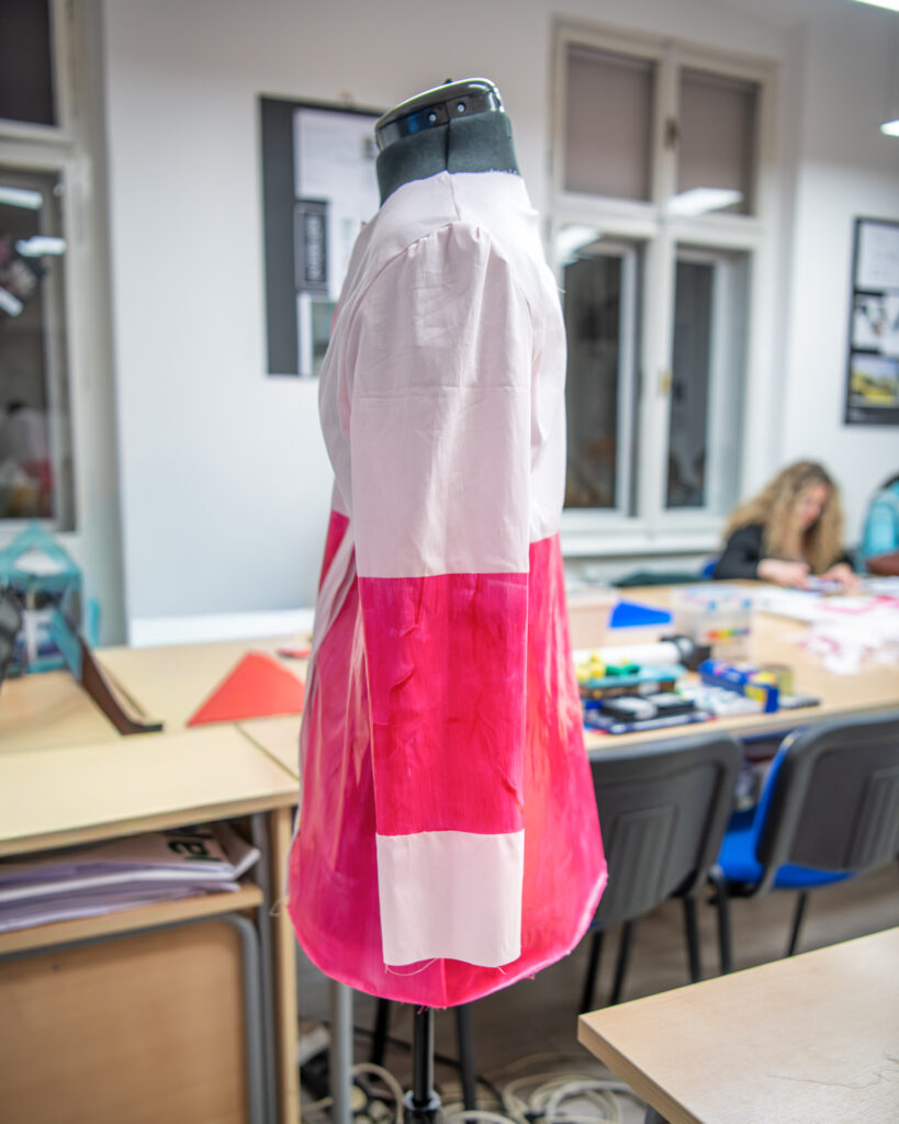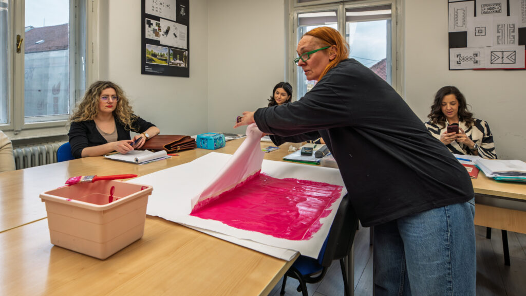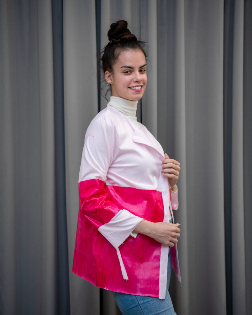 Na drugoj radionici polaznici su ručno aplicirali poliuretanski premaz s dodatkom pigmenta boje na tekstilnu površinu, konkretno, u izradi odjevnog predmeta – košulje. Pod vodstvom dipl. modne dizajnerice Mihaele Brajković, polaznici su istraživali kako tekstura, slojevitost i boja mogu transformirati material i dati mu novu dimenziju. Rezultat? Košulja koja ne nosi samo boju, već i dizajnerski potpis – pretvarajući tehniku apliciranja u umjetnost.