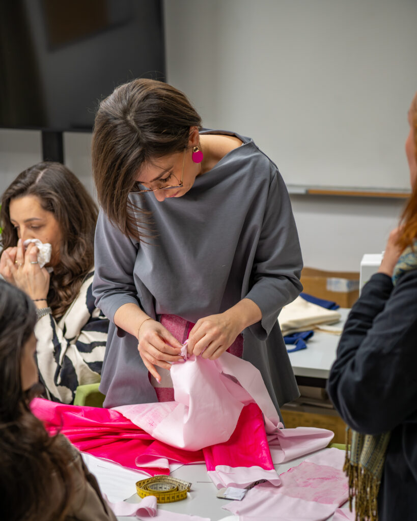 Najvažniji dio nastave bile su praktične vježbe odabira tkanine. Polaznici su, na temelju svojih skica i koncepata, birali optimalne materijale koji najbolje odgovaraju njihovim idejama. Cilj nije samo naučiti prepoznati tkaninu, već razumjeti kako je koristiti kao snažno sredstvo izražavanja.